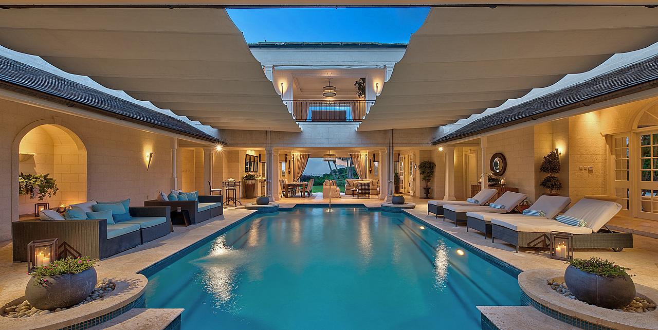 Windfall has a magnificent, unique feature. It has a wonderful, palatial indoor, open-air pool. This has the added benefit of a retractable, overhead canopy providing maximum shade and privacy.